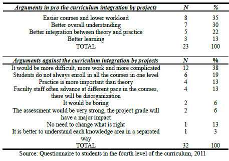 Regarding the question #3, students were asked to explain their choice. Table 4 shows the main categories on their answers; 23 students gave arguments in favor and 32 against the integration by projects.
