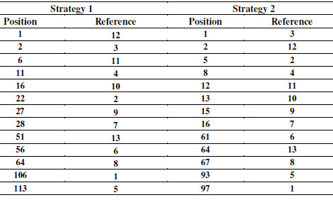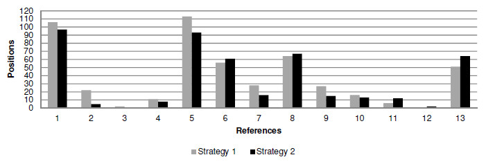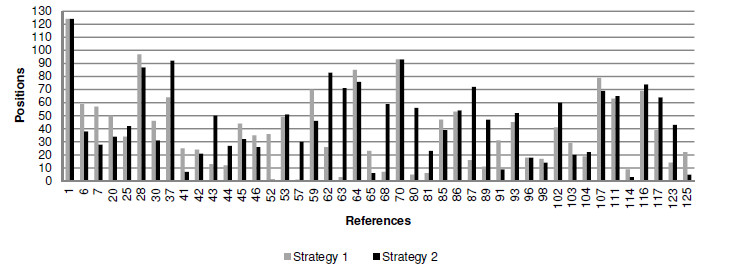 Figure 10 graphically presents the variation of the references positions regarding the applied strategies. Analyzing Figure 10, we can notice different positions for the same reference in the both strategies. For example, Strategy ranked the reference 5 in the position 113 whilst the Strategy 2 ranked it in the position 93. That is, reference 5 was better positioned by Strategy 2 because its position is closer to the top of the rank (position 1).