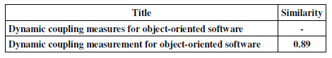 The implemented algorithm receives, as input, a Bibtex file (a set of references R) and returns a CSV (Comma Separated Values) file with each reference and its duplicates along with their degree of similarity (list of duplicates L). Figure 4 shows an example of the output of the Strategy to Detect Duplicates. This example depicts a group of references indicated as duplicates, i.e., the algorithm read the reference “Dynamic coupling measures for object-oriented software” from the input and indicated the reference “Dynamic coupling measurement for object-oriented software” as a duplication with 0.89 of similarity between them.