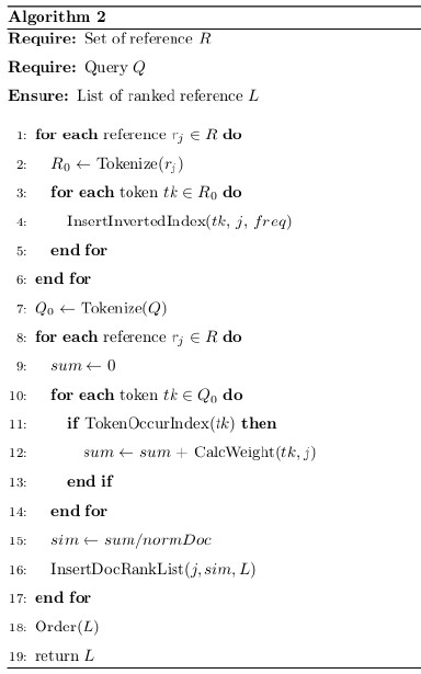 The algorithm, depicted by Figure 6, shows the steps of the Strategy 2 to rank the references. It receives as input a set of references R and a query Q, and returns a list of ranked references L. This algorithm is similar to the algorithm of the Strategy 1 regarding to its division in 2 steps, the use of the inverted index structure, and the tokenization process. The first step is the same of the Strategy 1: tokenizing each reference and inserting it into the inverted index.