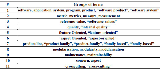 (software OR application OR system OR program OR product OR software product” OR “software system”) AND (metric OR metrics OR measure OR measurement) AND (quality OR “internal quality”) AND (modularization OR modularisation OR modularity) AND (maintenance OR maintainability) AND ((“feature oriented” OR “feature-oriented” OR “product line” OR “product family” OR “family based” OR “product-family” OR “family-based”) OR ((“reference value” OR “reference values”) AND (“aspect oriented” OR “aspect-oriented”) AND (concern OR aspect) AND (crosscutting OR “cross-cutting”)))