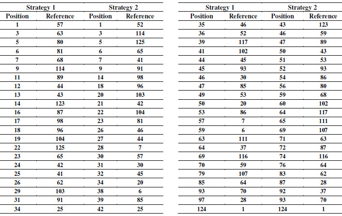 Strategy 1 and Strategy 2 retrieved 126 references from the 165 references of the SLR-2. Table 10 and Figure 11 present the variation of the SLR-2 references position. For example, in the first position of the Strategy 1 and the Strategy 2, we have the references 57 and 52, respectively.