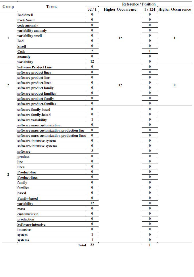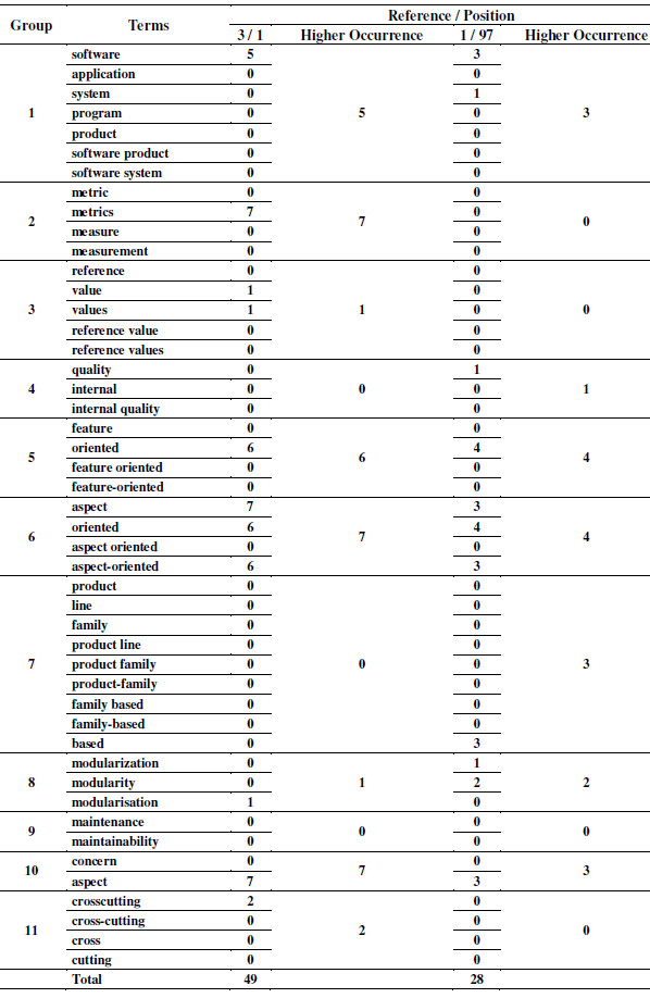 We manually counted the terms of the references positioned in the first and in the last position by both strategies applied in both SLRs. Table 11 and Table 12 present the counting of terms of the SLR-1, and Table 13 and Table 14 present the counting of terms of the SLR-2. For example, in SLR-1/Strategy 1 (Table 11), the term software appears 18 times in the reference 12 (position 1), and 9 times in the reference 5 (position 113).