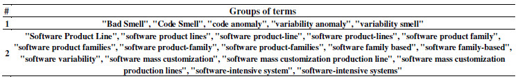 Table 1 and Table 2 present the terms used in the search strings in the SLR-1 and SLR-2, respectively. Each line of these tables represents a group of terms (term and synonyms) from the text file that has the search string. We can notice that SLR-1 search string has 11 groups with 33 terms (Table 1), and SLR-2 has 2 groups with 21 terms (Table 2).