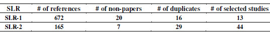 Table 3 summarizes the number of references in SLR-1 and SLR-2. For example, in SLR-1, 672 references were exported by the search engines. In this collection of references, 20 non-papers and 16 duplicates were detected. At the end, only 13 references were selected for full-text read (Table 4).
