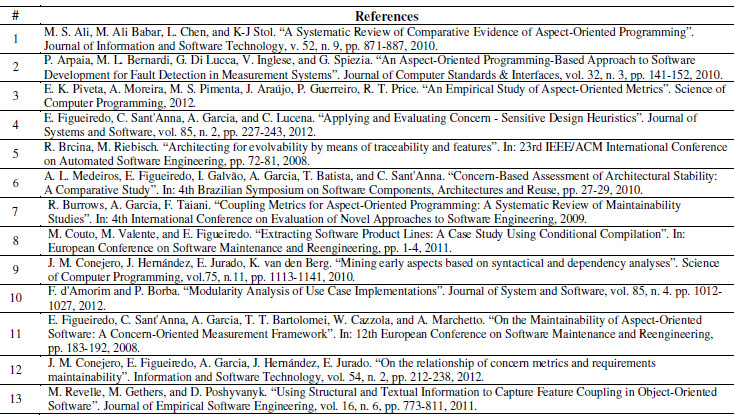 [10] R. Abilio, P. Teles, H. Costa, E. Figueiredo. “A Systematic Review of Contemporary Metrics for Software Maintainability”. In: 6th Brazilian Symposium on Software Components Architectures and Reuse (SBCARS), pp.130-139, 2012.