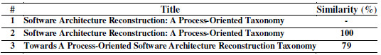 Table 7 shows references that have different titles indicated as duplicates. The title of the third reference is different from the title of the first and second references: “Towards A Process-Oriented Software Architecture Reconstruction Taxonomy” and “Software Architecture Reconstruction: A Process-Oriented Taxonomy”. The manual process detected the similarity between the first and the second references, but the third reference was not detected. Analyzing why the algorithm indicated that similarity, we notice that first and second references may be an extension of the third because they have 19 pages and were published in a journal, in 2009, by two of the authors of the third reference, while, the third reference has 12 pages and was published in a conference in 2007. The manual process missed this similarity due to differences in the titles.