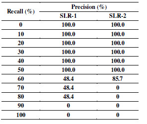 Table 15 and Figure 12 show the recall and precision of the strategies to rank references. For example, in SLR-1/Strategy 2, when 80% of the selected references are retrieved (recall), the precision is 50%. We can note that Strategy 2 was equal to or better than Strategy 1, i.e., it ranked the selected references closer to the top of the rank. When applied in the SLR-2, Strategy 2 was better than Strategy 1 in the first two recall levels obtaining 100% of precision. However, Strategy 1 obtained higher precision in the other recall levels.