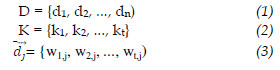 Let D be a collection of N documents (1) and let K be the set of t distinct terms that appear in documents of D (2). For each pair (ki, dj), ki belonging to K and dj belonging to D, it is associated a weight wi,j ≥ 0. A document dj is represented as a vector of weights (3). Each wi,j represents the importance of the term ki to describe the semantic content of the document dj.