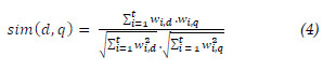 A scheme used to calculate the weights, known as TF-IDF (Term-Frequency x Inverse Document Frequency), consider the frequency of the term in the document (TF) and the rarity of the term in the collection (IDF). The degree of similarity between a query q and one document d is evaluated as the correlation between the vectors dj and q. . This correlation can be quantified by the cosine of the angle between those two vectors (4). This similarity measure is known as Cosine Similarity [9].