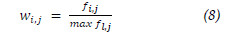 Aiming to reorder the references according to their relevance regarding the search string, we proposed two ranking strategies. In both strategies, we used the Vector Model and the weights of the terms in documents were calculated using only the information present in the input document, i.e., global information was not considered, such as, the IDF that requires data from a collection of documents to be calculated. The weight of a term in a document is defined by its frequency in the document. Therefore, the more times the terms of the query appear in a document, more relevant that document is to the query. To obtain this relevance, the weight wi,j of the term i in document j (8) is calculated, being fi,j the frequency of the term i in document j, and max fl,j the frequency of the term l, where l is the most frequent term in document j. In both strategies, we considered title, abstract, and keywords of the references.