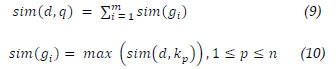 The idea in the Strategy 2 is to define a ranking function that simulates the Boolean expression of the search string. The search terms were organized in groups that aggregates a term and its synonyms using the OR connector. The groups are then connected by the AND connector. To verify the similarity of a document with regard to the query, we calculate the similarity (9), considering gi as the ith group of terms, sim(gi) the maximum similarity obtained in the group (10), kp as the term in the position p between n terms of the group i, and sim(d, kp) the similarity obtained by the cosine similarity (4).