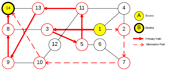 - Reroutable Class (Class C): The shortest path is assigned as primary without protection; however, when a failure happens, then a backup path is calculated if it were possible.