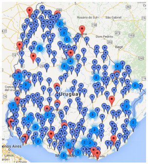 In the first stage of the project, 8000 bands were digitalized, corresponding to rain intensity records for the cities of Montevideo, Rocha, Paysandú and Artigas (Uruguay), recorded between 1968 and 2010. In a second stage, more than 30.000 images from more than 50 meteorological stations across the country were processed. Figure 14 presents the map of the regional (red) and local (blue) meteorological stations in the country providing data for the digitalization process; for each of them, more than a century of rain record are available to process. Actually, new data are periodically provided by the National Institute of Meteorology and processed using the software developed by the Digi-Clima project.