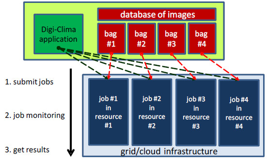 In the distributed version of Digi-Clima developed for grid infrastructures, the processing is performed by a set of independent pilot jobs that cooperates to process the database of images from the Digi-Clima project.