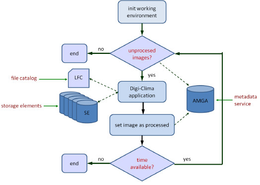 Once submitted and assigned to a computing element, each pilot job runs a loop, executing the Digi-Clima application on each iteration to process multiple images without the delay due to job submission and the setup of the computing environment. Grid file services are used to distribute the images and to get the results: i) a file catalog service is used to locate files or replicas in every storage element in the grid, and ii) a metadata managing service is used for accounting on the images metadata as processing status and the mapping between the original image file names and their corresponding results. In the grid implementation developed for Digi-Clima, we use the LCG File Catalogue (LFC) [19] from the Worldwide Large Hadron Collider Computing Grid (WLCG), which allows maintaining a mapping between the logical file name (LFN) for each image and the physical storage URL of all of the file replicas. We also use the ARDA Metadata Grid Application (AMGA), a general purpose metadata catalogue developed by the European Middleware Initiative middleware distribution [20]. A metadata catalog is conceived as a simplified database of non-file related data, too small or too volatile to be stored in data files.