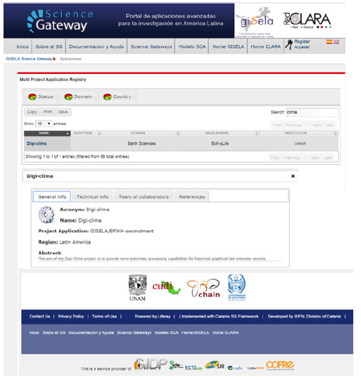Web implementation in the GISELA Scientific Gateway. A specific web implementation of the distributed Digi-Clima application was developed to be included in the GISELA Scientific Gateway. The GISELA Scientific Gateway is a web service that allows users to send and administrate jobs to be executed and data to be processed in the grid, from a web browser. The Liferay portal [21] is used to implement a Java user interface for the execution of Digi-Clima in the grid. The implementation makes use of portlets, pluggable user interface software components [22]. Specific portlets were developed over Liferay to be used as component of the user interface for the execution of Digi-Clima. The portlets generate code in the HTML markup language to define the set of images to process and the parameters of the application. All the code generated by the portlets is integrated in a specific web page for the application, within the GISELA Scientific Gateway. The website of Digi-Clima in the GISELA Scientific Gateway is available in the URL https://gisela-gw.ct.infn.it/application-database and the home page of the application is shown on Figure 18.