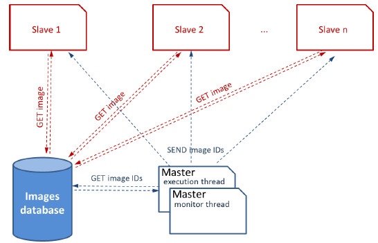 A simple fault tolerance mechanism was implemented in order to provide support for not losing the information of already processed images when an unexpected event causes the execution to abort. The master process keeps metadata of the images assigned to each slave (including the path to the physical location of the image and its processing state). These metadata are updated every time that an image is assigned and the processing status changes (from 'unprocessed' to 'processing' to 'processed'). This information is used by the fault tolerance mechanism: before starting a specific task, assigning a new workload, or processing a set of images, both the master and the slave are able to check the status of every image to assign, allowing to continue the processing where an aborted slave left it in the past.
