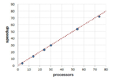 The computational efficiency results reported in Table 1 demonstrate that the parallel implementation is able to achieve almost linear speedup values when using up to 74 processes executing on computing resources from the Cluster FING infrastructure. The speedup values are slightly better when using the full Digi-Clima application when compared with the lightweight prototype implementation. This result confirm previous experiments regarding the increasing values of speedup when processing more images [26] and it suggests that there is a relationship between the number of images to process and the number of slave processes used in the parallel implementation: when a more intensive utilization of the computing resources is demanded, better speedup values are obtained. This is explained because the impact of the overhead of both the initialization times and the communications between processes are reduced when processing more images. Figure 20 summarizes the speedup results obtained for the master-slave Digi-Clima implementation in the Cluster FING infrastructure.