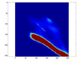 The chromatic segmentation is performed by computing the tridimensional histogram of color distribution for pixels in the RGB space, applying a parametric discretization of each color band using scales of 64, 128, or 256 bits. The histogram H(R,G,B) is represented by a tridimensional matrix N (64×64, 128×128, or 256×256) whose elements (n,i,j,k) indicate the number of pixels on the image (n) with the corresponding values of i, j, and k for R, G, and B, respectively. Figure 5 presents a bi-dimensional cut of an histogram for a band, considering the values of R in abscissas y G en ordinates. The color scale corresponds to the frequency of appearance of each color combination: blue corresponds to low frequency of appearance and red to the high frequencies. Figure 5 shows a dominating population of pixels aligned in a compact and connected region, with high correlation on values of (R,G), as it is expected given the pattern of the monochromatic impression of the millimeter band.