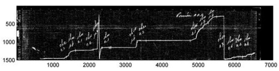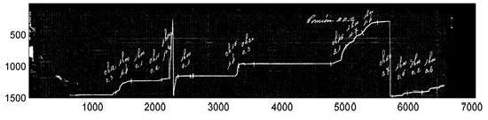 In the sample band in Figure 2, several of the inherent troubles that make the digitalization problem difficult are shown, including a discontinuous ink line, ink stains, different intensity levels on the record line, and other defects that are consequences of the measuring procedure using an analogical device. Furthermore, manuscript annotations are also present in the band to account for additional data, usually written by operators when the band was removed from the pluviometer. Nevertheless, the band presented in Figure 2 is in excellent conditions of conservation, many other bands are ragged, severely stained, or almost impossible to read, as the sample band presented in Figure 3 (corresponding to the city of Paysandú, year 2011).