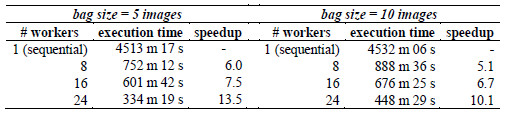 Distributed implementation in the Ourgrid volunteer computing platform. Table 3 reports the times required to process a database containing 500 images using the full implementation of the Digi-Clima application. The time required to process an individual image differs, depending on the specific characteristics of each image. Processing times between 4 and 20 minutes have been observed, and the average execution time is 12 m 40 s. In the evaluation reported in Table 1, we consider four different numbers of Ourgrid worker processes (1, 8, 16, and 24). When using 8, 16, and 24 workers, Ourgrid allocated the computing resources in the volunteer infrastructure and each worker is assigned a bag of images to process. We performed a fine tuning of the number of images in each Bag-of-Tasks; we evaluate using 5 and 10 images in each bag. We evaluate the computational efficiency of the distributed algorithm in each case.