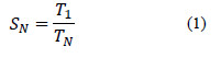 Master-slave implementation in Cluster FING. The master-slave implementation was evaluated in two scenarios: a) using a lightweight prototype of the Digi-Clima application, with an execution time in the order of one minute per image and a reduced database of 1000 images b) the full Digi-Clima application and a database of 5000 images. In both cases, we evaluated the execution time of the sequential and the parallel processing using different numbers of processes. The execution time results are summarized in Table 1. We also report the speedup values when using different number of processes. The speedup is a metric that evaluates the acceleration on the execution times when using a parallel implementation when compared against the sequential implementation. The speedup is defined by the expression in Equation 1, where T1 is the execution time of the sequential implementation (using only one process) and TN is the execution time of the parallel implementation using N processes executing in N computing resources.