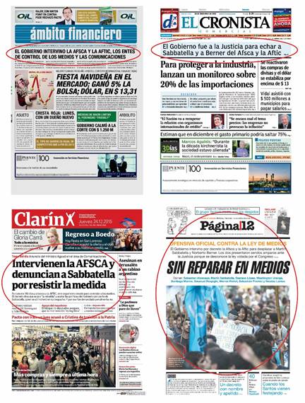 Al profundizar en las diferencias halladas entre las coberturas periodísticas, se encontró que el único día que el tema apareció como título principal en la portada de Clarín, el diario destacó la decisión del Gobierno de intervenir los organismos encargados de regular los medios audiovisuales y las telecomunicaciones (decreto 236/2015), que habían sido creados durante los gobiernos de Cristina Fernández de Kirchner. La bajada del título subraya que la intervención en el área de las Comunicaciones se extiende “durante 180 días y alcanza a la AFTIC, otro organismo creado para controlar a los medios. El decreto dice que es por ‘la rebeldía’ a acatar las políticas del Gobierno por parte de Sabbatella” (Clarín, 24 de diciembre de 2015). La nota principal se acompaña con dos columnas de opinión, una nota secundaria acerca del “Apoyo del massismo” a la medida, y el análisis de un periodista del diario bajo el título “Herramientas para castigar a medios independientes”. En otras palabras, el matutino otorgó a este acontecimiento (la intervención ejecutiva de dos organismos públicos) una relevancia mayor que al resto de las medidas de política de comunicación. Además, valoró el hecho en términos positivos, en tanto la medida procuraba normalizar el funcionamiento de agencias creadas “para controlar a los medios”, al frente de las cuales se hallaban “autoridades rebeldes” que no se alineaban con el nuevo Gobierno.