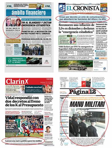 La investigación halló que, en términos generales, la mayor parte de las noticias se trató sobre “Medidas administrativas del Gobierno nacional” (21,5 %). A lo largo de los dos primeros meses de gobierno las noticias cubrieron principalmente los anuncios y la promulgación de diversas disposiciones, enfocándose en los aspectos técnicos generales de aquellas, sus alcances y limitaciones, sus implicancias sobre la reorganización de la estructura del Estado y la designación de nuevas autoridades al frente de los organismos públicos. En este punto, Ámbito Financiero y Página/12 fueron aquellos que mayor importancia le otorgaron a este tópico. Así, por ejemplo, el primero tituló “Aguad: correo y Arsat”, el 31 de diciembre de 2015, para referirse a algunas de las implicancias del DNU 267/15 que suponían colocar bajo la órbita del flamante Ministerio de Comunicaciones (creado unos días antes por medio del DNU 13/2015, a frente del cual se designó a Oscar Aguad), una serie de programas y entidades entre los que se hallaban la empresa Argentina Soluciones Satelitales S. A. (ARSAT) -lo que incluía a sus satélites, la red federal de fibra óptica y la operación de la Televisión Digital Abierta- y el Correo Oficial. En la misma fecha, Ámbito tituló “Medios: cuarto DNU de Macri que se acumula en el Congreso”, enfatizando el modo elegido por la nueva Administración para intervenir sobre el sector info-comunicacional. Por su parte, Página/12 calificó como título principal de portada: “Manu militari”, para referirse a los anuncios del gobierno de modificaciones por decreto.