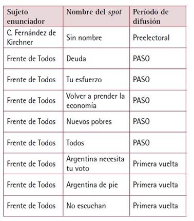 Una segunda indicación remite a la selección de las unidades de análisis. El estudio del esquema argumental que propone la teoría actancial se reconoce, en relación a los anuncios electorales de la citada coalición, con mayor intensidad en imágenes en movimiento que sobre los soportes fotográficos que establecen las imágenes fijas. Por tal motivo, se conformó un corpus de spots, difundidos en las dos jornadas de elección presidencial durante el plazo legalmente establecido por la Cámara Nacional Electoral.
