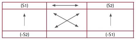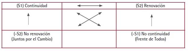 El cuadrado semiótico se compone por dos términos antagónicos (S1 y S2), a cada uno de los cuales se le opone su término contrario (-S1 y -S2). El eje seleccionado para aplicar este esquema ha sido, en relación a las elecciones 2019, el modelo de gobernabilidad para el siguiente mandato presidencial (2019-2023). Este cuadrado permite a la vez que prohíbe ciertas asociaciones entre los términos, las cuales se señalan mediante las flechas incluidas en el Cuadro 3.
