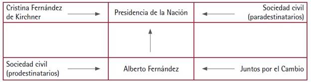 En efecto, en las primeras horas de aquel día, los medios de comunicación dieron cuenta de un video que Cristina Fernández de Kirchner subió a sus redes sociales y que produjo un vuelco inusitado en el armado de las estrategias electorales de las principales alianzas de representación política. El anuncio de la fórmula presidencial del espacio político (Fernández-Fernández de Kirchner) significó, en términos de la teoría del actante, el corrimiento de Fernández de Kirchner en tanto sujeto y su incorporación a la trama de la campaña en calidad de destinador.4