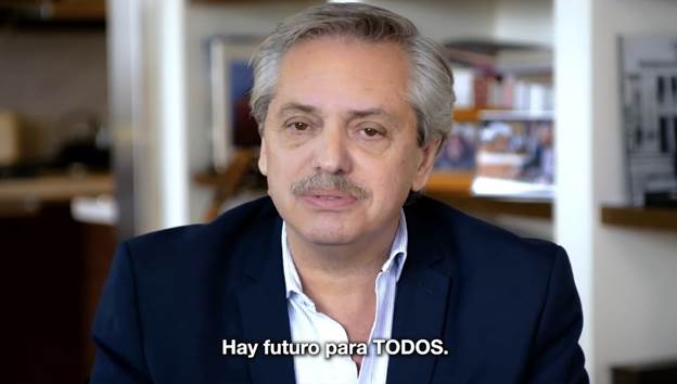 El destinador se trata entonces de la fuente de las competencias que ostenta el sujeto, quien se sustenta en ellas en su trayecto de búsqueda hacia el objeto, de manera que se corresponde con el origen del esquema narrativo. El destinatario, por el contrario, se corresponde con el actante que recibe y se beneficia con la posesión del objeto por parte del sujeto, por lo que se advierte un canal de comunicación que se inicia en el destinador y culmina en el destinatario, a través de cual se desplazan el sujeto y el objeto. Este segundo par de actantes también ha sido reconocido en la serie de propagandas del Frente de Todos, incluso con anterioridad al inicio formalmente establecido por la Cámara Nacional Electoral para difundir avisos en medios tradicionales de prensa.3 El destinador, en una proporción asombrosamente similar a como ha sido definido por Greimas (1971), se posicionó de manera oficial, en la mañana del sábado 18 de mayo de 2019, como horizonte de inicio de la estructura narrativa de la campaña nacional.