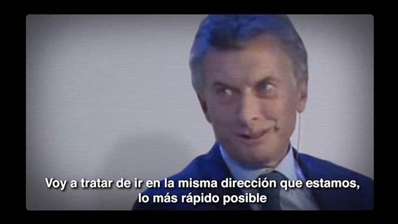 El actante oponente ha sido incluido, en el esquema audiovisual de los anuncios, a través del mismo proceso de desembrague. La inclusión de una escena de Macri, ya descripta en el anuncio Deuda, constituye una característica de este proceso (Figura 6). Frente de Todos, en tanto narrador implícito, proyecta hacia el interior del spot una representación audiovisual del oponente que obstaculiza la posesión del objeto. De este modo, el enunciado de Macri (“voy a tratar de ir en la misma dirección que estamos, lo más rápido posible”, Frente de Todos, 2019a) es entonces un texto, con respecto al cual Fernández enuncia su metatexto: “Macri dice que si gana su plan es…” (Prensa Frente de Todos, 2019a).
