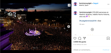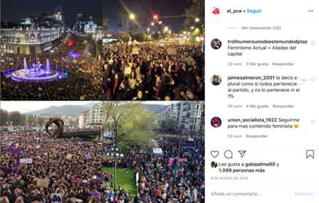 Aunque se pueden disputar las cifras de una manifestación, el hecho de que la red se llene de imágenes diversas de diferentes espacios públicos de importancia simbólica en muchas ciudades sirve como estrategia para desestabilizar el monopolio de la representación de lo real (Sierra-Caballero, 2018). La acumulación de imágenes similares en diferentes ciudades o desde diferentes puntos de vista en la misma ciudad confiere, por su propia reiteración, una saturación del espacio virtual que se ve ocupado por las manifestaciones feministas, apareciendo una y otra vez en los timelines. Si el discurso dominante consigue imponer su relato por medio de la omnipresencia y la repetición, las RRSS consiguen configurar un espacio público oposicional (Sierra-Caballero, 2018), desde el que responder con la misma estrategia, sin olvidar que la propiedad de estas redes responde a los mismos conglomerados mediáticos que disputan el relato. Pero, además, este mismo hecho, obliga a que en el discurso dominante representado en los medios de comunicación se incorpore la lectura de “éxito” de la movilización que se multiplica en la red.
