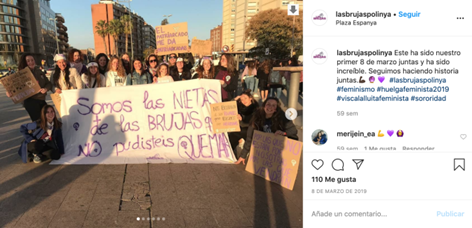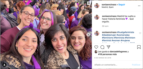 Estos autorretratos no solo rompen el papel asignado culturalmente a las mujeres. De hecho, no se representan sexualizadas, ni sumisas, ni como víctimas, ni como objetos pasivos a los que mirar. En la mayoría de las imágenes, las mujeres se representan mostrándose fuertes y sonrientes, a veces incluso realizando gestos de empoderamiento como levantar el puño. Uno de los detalles que más destaca de estas fotografías es que siempre se retratan en grupo, juntas, identificándose con uno de los ejes del discurso feminista: la sororidad. En este proceso de fotografiarse juntas, como decía Mirzoeff (2016), parecen querer encontrarse a sí mismas como grupo dentro del movimiento feminista y, a la vez, mostrarse a los demás mediante la digitalización y el acto de compartir en redes dicho momento. A este respecto, las mujeres son sujetos doblemente activos: ante el agenciamiento de tomar control sobre su propia representación; al representarse como sujetos que generan acción: se manifiestan, se juntan… No es casual, por tanto, que el escenario que se repite en las fotografías sean las calles en el momento de manifestaciones, en el espacio público y el acto de la manifestación, espacios y acciones, ambos políticos. Pero, además, el acto de compartir las imágenes en redes genera una acción más, como se apuntaba para el caso de Brasil (Nemer y Zhang Freeman, 2015), propiciando conscientemente la construcción de vínculos y generando comunidad. De hecho, la elección del modo de compartir las imágenes incide en este aspecto.