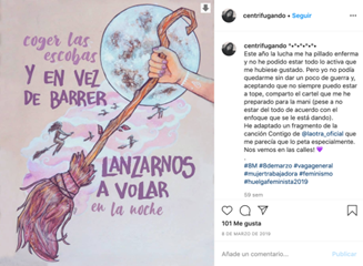 El hecho de leer al 8M como dispositivo inacabado (Padilla, 2012) y, por tanto, entender que parte del control se ceda a la colectividad, permite que -adhiriéndose a las líneas generales del manifiesto consensuado en el 8M- cualquiera pueda aportar su ilustración para apoyar la convocatoria. Las hibridaciones no se dan únicamente entre lo real y lo virtual, cuya división, como ya ha sido expuesto, deja de tener sentido, sino que los contenidos viajan de un formato a otro desarrollando un relato transmedia de autoría colectiva.