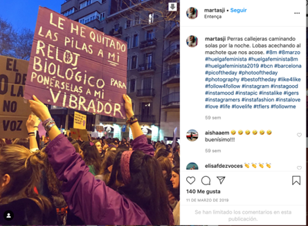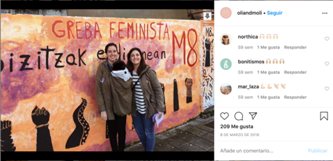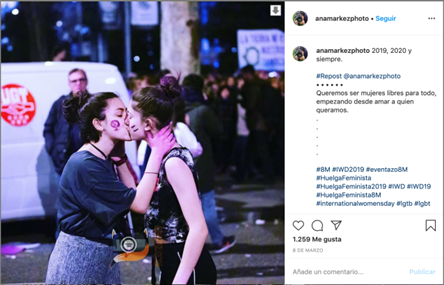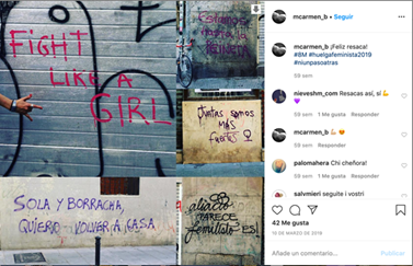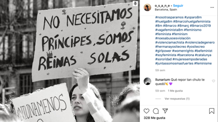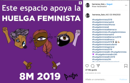 Los retratos son compartidos en Instagram con una breve descripción y uno o varios hashtags que sirvan para localizarlas. El hecho de identificarse a través de la etiqueta de la huelga implica una vinculación con el movimiento feminista, pero, además, el propio hashtag se constituye en un relato caleidoscópico donde los retratos y autorretratos de mujeres se suceden, sirviendo de réplica digital a las mareas humanas que copan las calles. Se opera un cambio constante de quien observa y es a la vez observada, en tanto que como usuarias de Instagram y seguidoras de la etiqueta #huelgafeminista2019 desfilarán por sus dispositivos muchas otras como ellas. El retrato en este caso involucra una acción. Ya no se dice únicamente “estoy aquí”, sino “estoy participando de este evento” y supone un acto de compromiso político con la huelga feminista. Senft y Baym (2015) usan el término “solidaridad reflectiva en red” para describir el modo en que las RRSS propician la generación de vínculos con otras personas con convicciones políticas similares a las nuestras y cómo esta solidaridad está en la base de la mayoría de las campañas virales.