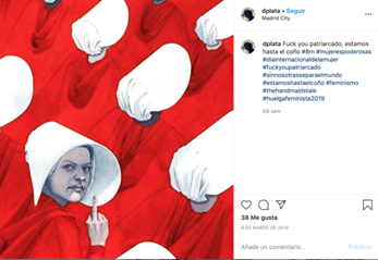 El siguiente ejemplo (Figura 13) se caracteriza por el uso de referentes de la cultura de masas, otra característica destacable del 8M. Se parte de una ilustración que representa a los personajes de la serie El cuento de la criada, distribuida por HBO en España. Esta serie tiene un linaje feminista claro, ya que procede de la novela de Margaret Atwood que narra un futuro distópico donde el patriarcado se ejerce sin límites. El uso de la simbología generada por la serie aparece en la ilustración, pero también en pancartas (Figura 14), memes (Figura 15) y en los propios cuerpos de las manifestantes, que se disfrazan como en la ficción para acudir a las manifestaciones (Figura 16).