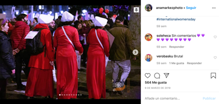 A continuación, se presentan los principales resultados obtenidos a partir del análisis de las imágenes publicadas en Instagram bajo la etiqueta #HuelgaFeminista2019. Aunque la discusión ha sido organizada de forma independiente en torno a las cinco categorías establecidas, siguiendo las intervenciones de las expresiones feministas identificadas en la plataforma, las agrupaciones no funcionan herméticamente sino todo lo contrario. Tanto las narrativas como las categorías se mezclan y se caracterizan por contener elementos transmedia. El caso más completo es ejemplificado con las expresiones feministas que se apoyan en referentes de la cultura de masas, como la serie El cuento de la criada.