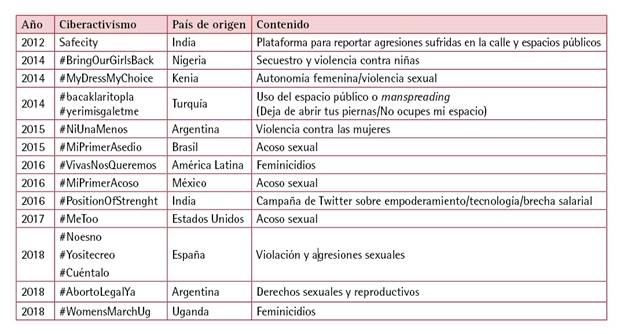 Las etiquetas presentadas en la Tabla 1 muestran algunos ejemplos paradigmáticos de “activismo hashtag” (Yang, 2016), que en clave feminista apropian la tecnología (Clark, 2016; Esquivel-Domínguez, 2019; Laudano, 2017; Olmedo-Neri, 2020; Reverter-Bañón & Medina-Vicent, 2020) con fines políticos. Estas fórmulas han servido de llamada para las movilizaciones masivas y han enmarcado denuncias concretas en relatos e identificaciones colectivas sobre problemas sociales a partir de un repertorio expresivo común que accede a la política desde otro lugar. Aunque sus contextos son diferentes, su naturaleza es la misma: la lucha contra todo tipo de violencia machista.