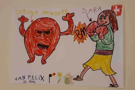 Este vínculo entre el enemigo y la fealdad es evidente en el caso de las representaciones axiologizadas y no-científicas del coronavirus, las que, sin dudas, han jugado un papel importante en cómo el virus ha sido imaginado tanto por individuos como por sociedades. Como se puede apreciar, estas representaciones incluyen criaturas que podrían ser identificadas como monstruos, una categoría de sentido ya conocida por las audiencias y que, a pesar de las evidentes diferencias culturales que se evidencian entre representaciones mentales e imaginarios de este tipo, los ayudan a atribuir sentido a la nueva amenaza. En este sentido, las cinco imágenes analizadas en esta sección podrían, por ejemplo, ser fácilmente confundidas con pokemones por alguien que no esté familiarizado con los personajes de esta franquicia. Representaciones del coronavirus como un monstruo, un alienígena y otras criaturas malvadas, enojadas, feas y no humanas también fueron utilizadas en contextos mediáticos audiovisuales, como noticieros (Andacht, 2020) y la prensa (“The aliens among us”, 2020). Pero también pueden encontrarse en expresiones creativas como la que se muestra en la Figura 11. El hecho de que dicho dibujo haya sido creado por un niño parecería confirmar la hipótesis de una percepción de lo desconocido que está mediada por las categorías ya conocidas, como la de monstruo.