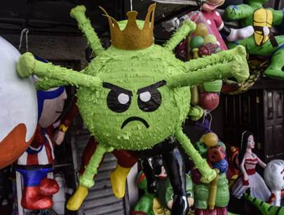 Otro ejemplo interesante de este modo de representación, en este caso perteneciente al mundo offline y valioso en cuanto que evidencia que la representación del virus no es un fenómeno solamente limitado a los ámbitos mediáticos, es la producción de las tradicionales piñatas en América Latina (Figuras 9 y 10).