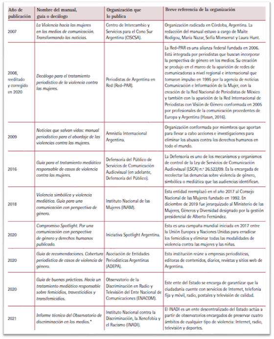 Los primeros manuales producidos en Argentina dialogan con un dossier de prensa publicado por el Instituto Oficial de Radio Televisión Española (RTVE, 2002), el cual trazó los primeros lineamientos sobre coberturas de casos de violencia de género. Este dossier surge luego de la cobertura del asesinato de Ana Orantes, en 1997. Orantes había denunciado en un programa de televisión española los malos tratos que recibía por parte de su expareja. A las semanas, fue asesinada por su exmarido. La conmoción del caso produjo una serie de coberturas sobre un tipo de violencia que anteriormente no se consideraba importante o relevante. Esto expuso los profundos lazos entre violencia de género y medios de comunicación. Es posible entender que esta cobertura fue un puntapié para que organismos de la sociedad civil se vieran interpelados en confeccionar un manual. Tal como se escribe en las primeras hojas de este documento, su finalidad fue brindar herramientas que permitieran tratar el tema con la necesaria sensibilidad, a partir de aportes de profesionales, juristas y agentes sociales (RTVE, 2002).