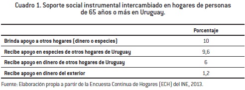 El análisis transversal se realizó con datos secundarios de la Encuesta Continua de Hogares (ech) del Instituto Nacional de Estadística (2013)[2], la cual se lleva a cabo entre la población residente en hogares particulares de todo Uruguay. En la base depurada se utilizó como criterio de inclusión que se haya preguntado acerca del uso de Internet (mayores de 14 años). En la muestra resultante, de 103.388 personas de 14 a 98 años, con una media de edad de 44,5 años, el 53% usa Internet al menos una vez al mes. Las personas de 65 años o más representan el 19% de la muestra y entre ellos se encuentra el 5% de los usuarios de Internet. Para realizar el análisis estadístico (spss v 17.0) se filtraron los casos de menores de 65 años, por lo cual el tamaño de la muestra con la que se trabajó fue de 19.318 personas, de 65 a 98 años, con una media de edad de 74,88. Se midió el apoyo social real, objetivo, que brindan y que reciben los hogares en los cuales viven las personas de 65 años o más en Uruguay, a través de variables proxy. Por un lado, se midió el apoyo social instrumental que brinda el hogar, a través del monto estimado de soporte en dinero o especies que algún miembro del hogar haya dado a otros hogares durante el mes anterior. El cuestionario de la ech 2013 solicitaba valorar el monto en caso de que se tratara de un intercambio de especies. Por otro lado, se midió el apoyo social instrumental recibido en el hogar de un familiar u otro hogar del país, el mes pasado. En este caso, en el cuestionario original se distinguió si el apoyo instrumental fue en forma de dinero o de especies. Además, se midió el apoyo social recibido del exterior en forma de dinero (Cuadro 1). Según datos oficiales, en 2012, el 9,8% de la población uruguaya residía en el exterior (Instituto Nacional de Estadística, 2013).