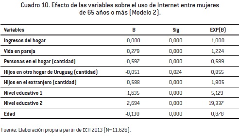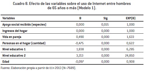 En definitiva, las variables que tienen mayor impacto sobre el uso de Internet en el grupo de hombres de 65 años o más (Cuadro 8) corresponden a un aspecto socioeconómico (educación, con impacto positivo) y a un aspecto de la estructura del convoy (cantidad de personas en el hogar, con impacto negativo).