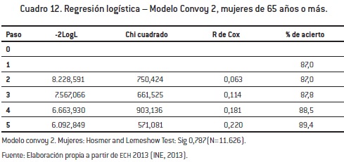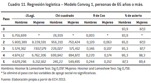 En el Modelo 1 masculino, el total de ingresos del hogar controla el apoyo brindado por los hombres a otros hogares (ya sea en dinero o especies), que deja de ser significativo en el paso 2. El apoyo recibido es controlado en parte por el total de ingresos del hogar, así como por todas las demás variables, pero no deja de ser significativo en el modelo en ningún paso. Los tres modelos que contemplan aspectos del convoy social vinculados al uso de Internet son significativos globalmente (Hosmer & Lemeshow Test, Cuadros 11 y 12); tienen un porcentaje global de acierto alto, aunque explican de manera insuficiente el uso de Internet (24,4% en el modelo de los hombres y 21,2% en el modelo de las mujeres). El Modelo 1 tiene mejor ajuste para el grupo de hombres que para el de mujeres, aunque en conjunto el porcentaje de acierto es menor (87,3% vs 89,4%). La inclusión de las variables relacionadas a los hijos en el Modelo 2 de las mujeres (Cuadro 12) no representó un aumento de magnitudes importantes en acierto, ajuste, o significación, aunque en todos los casos mejoró el modelo. La educación representa el paso más significativo del modelo entre las mujeres, en tanto que entre los hombres es el total de ingresos del hogar (chi cuadrado, Cuadro 11).