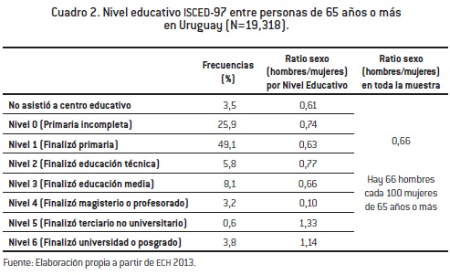 Las personas de 65 años o más representan el 19% de la muestra, 40% vive en Montevideo, 60% son mujeres, 71% jubilados, 37% son viudos y 49% vive con su pareja. 53% tiene entre 65 y 74 años, 35% entre 75 y 84, mientras que el 12% tiene 85 años o más. La mitad (49%) finalizó la escuela primaria, y el 4% completó la educación terciaria. Hay 66 hombres mayores por cada 100 mujeres del mismo grupo de edad. La comparación del ratio de sexo de la muestra de 65 años o más con los ratio de sexo por nivel educativo en este grupo etario (ver Cuadro 2) muestra que son más los hombres mayores que han finalizado los estudios terciarios (universitarios y de posgrado). También entre los de 65 años o más hay mayor proporción de hombres que no sabe leer o escribir y que no ha terminado la escuela primaria. Sin embargo, son más las mujeres de ese grupo de edad que no han asistido a centros educativos, y las que tienen la escuela primaria completa. La media de ingresos de los hogares donde viven las personas de 65 años o más ($36.637.-) es menor que la media de ingresos entre todos los hogares de la muestra ($44.153.-). En concreto, el tercer percentil (75%) vive en hogares que tienen ingresos por debajo de dicha media.