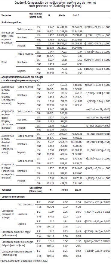 This paper explores the relationships between social networks and the use of the Internet among elderly people in Uruguay, founded on the social convoy theory framework. It focuses on the analysis of the relationship between Internet use, social support and social network structure of people aged 65 years and above. A cross-sectional analysis provided evidence of these relationships. In particular, a positive association between the Internet use among women and their children living abroad was verified in this age group. Furthermore, a positive association between living with partners and Internet use among people 65 years and above was observed. The analysis was conducted using secondary data from the Continuous Household Survey of the National Institute of Statistics of Uruguay (2013).