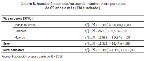 Se observó cuáles de las variables incluidas en este estudio se vinculan individualmente con el uso de Internet, utilizando comparación de medias (t‑Test, Cuadro 4) y tablas de contingencia (chi cuadrado, Cuadro 5), según la naturaleza de las variables. Se verificó que la media de ingresos es mayor entre los usuarios de Internet, tanto hombres como mujeres, en tanto la media de edad es menor para los mismos casos (Cuadro 4, variables sociodemográficas). La media de ingresos en los hogares de las personas que tienen 65 años o más, y usan Internet, dobla la media de ingresos en los hogares de personas de esa misma edad que no usan Internet (t-Test, Cuadro 4). También el sexo y el nivel educativo se vinculan con el uso de Internet entre los adultos de 65 años o más (Cuadro 5).